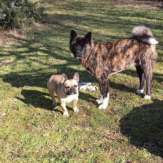 Cães e lobos são geneticamente idênticos, por isso classificados como sendo de uma única espécie: Canis lupus. Na imagem, um akita (fisicamente muito parecido com o lobo) e um buldogue francês.