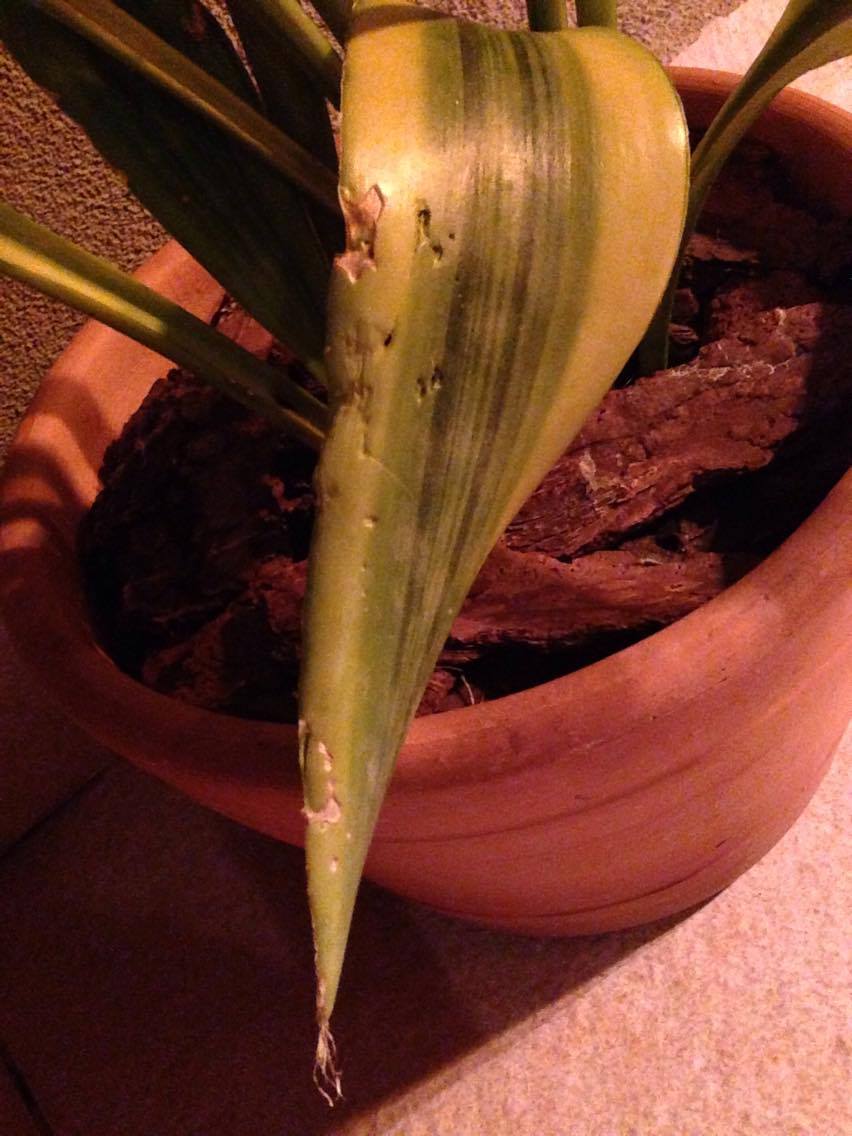 Folha de espada de São Jorge com as mordidas que foram suficientes para intoxicar o buldogue francês da nossa leitora. Assustador, né?